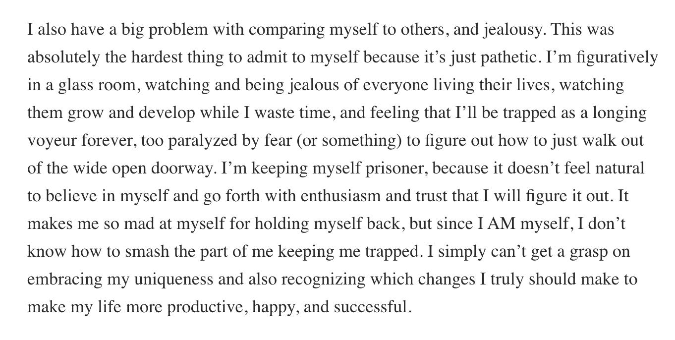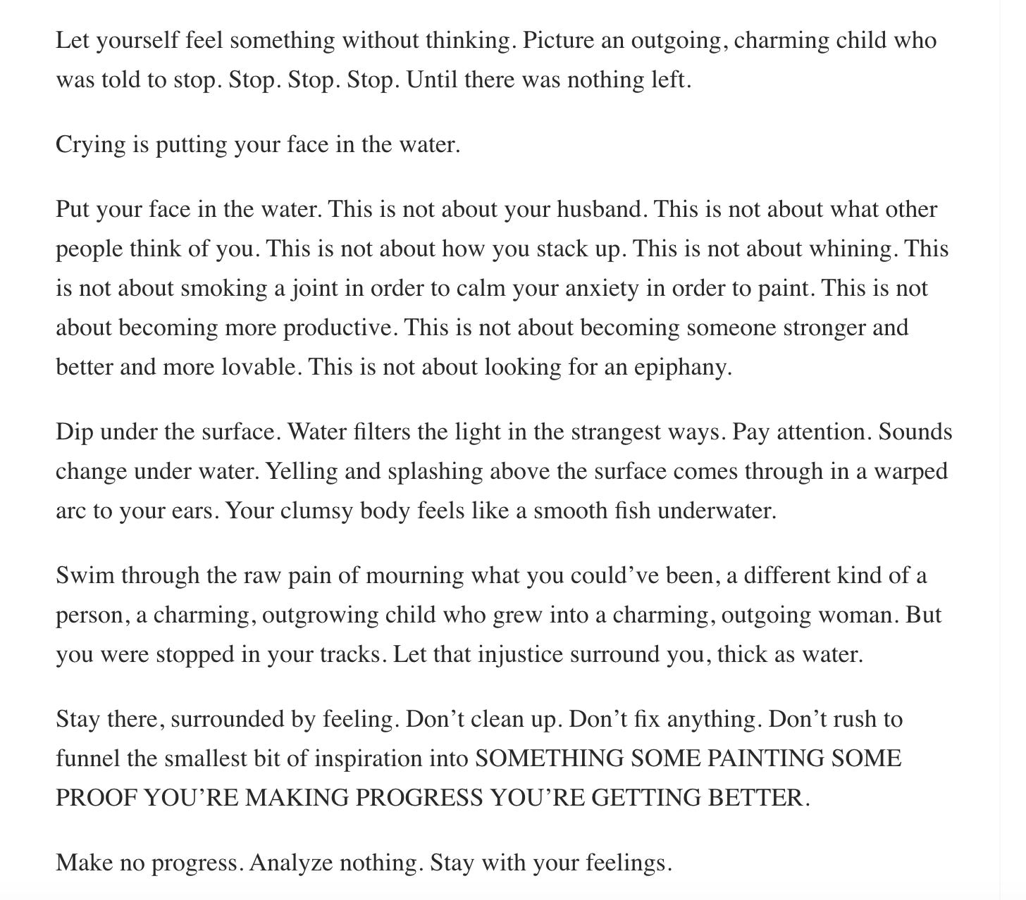 In fact, when your habit is to solve problems intellectually instead of taking a longer, slower path through your deepest emotions, you often become increasingly self-abnegating, avoidant, embarrassed, and anxious as you grow older. This letter shows how the poison of trying to fix things —and beating yourself up when it doesn’t work — starts to leak into everything and cause all kinds of new problems: self-hatred, neuroticism, a marriage in danger, creative blocks, confusion, dismissiveness.