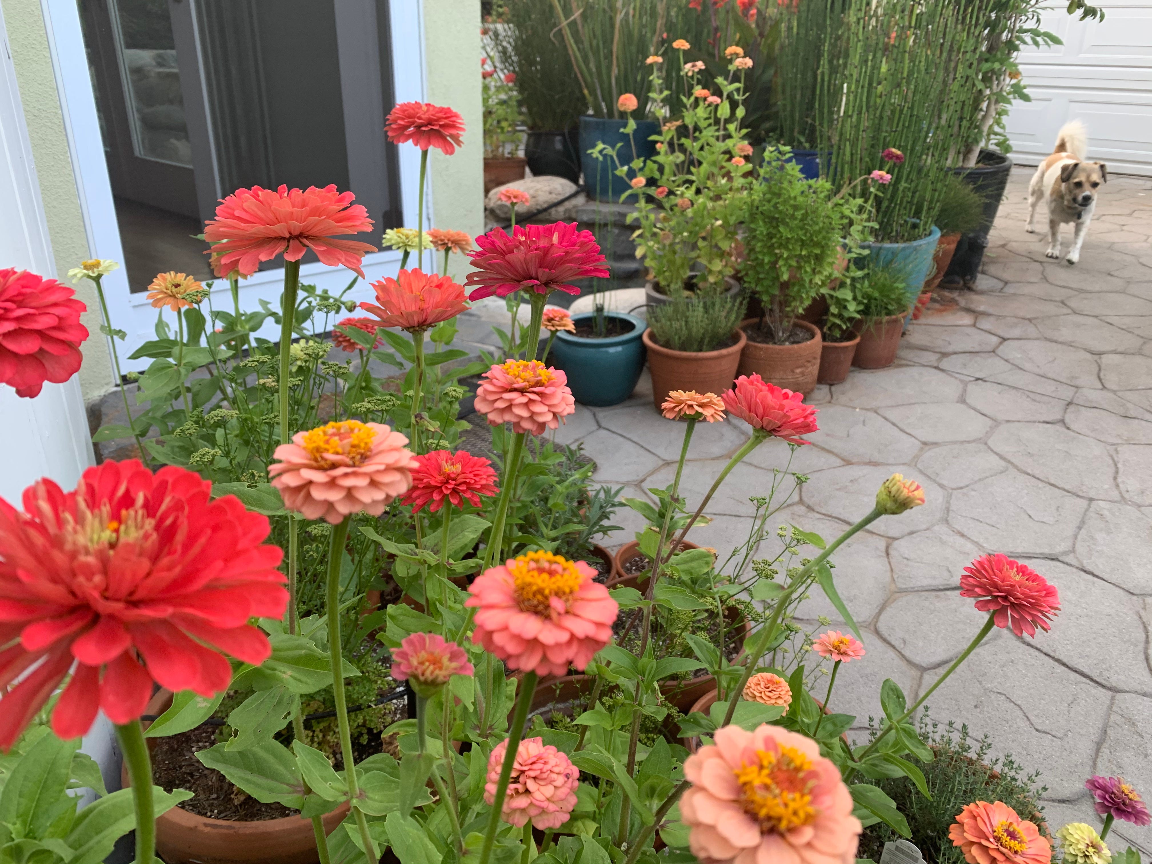 When we got back to Los Angeles, our driveway was a sea of zinnia blossoms. I knew I’d overdone it a little, stuffing every available pot and planter with tiny plants for months. But it was so exciting to see everything blooming at once. I felt like Dorothy arriving in Munchkinland.